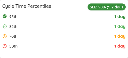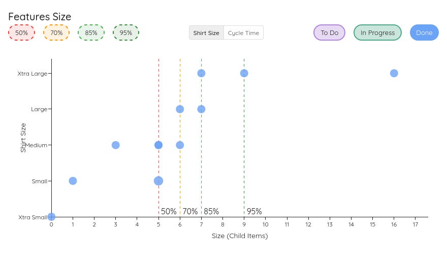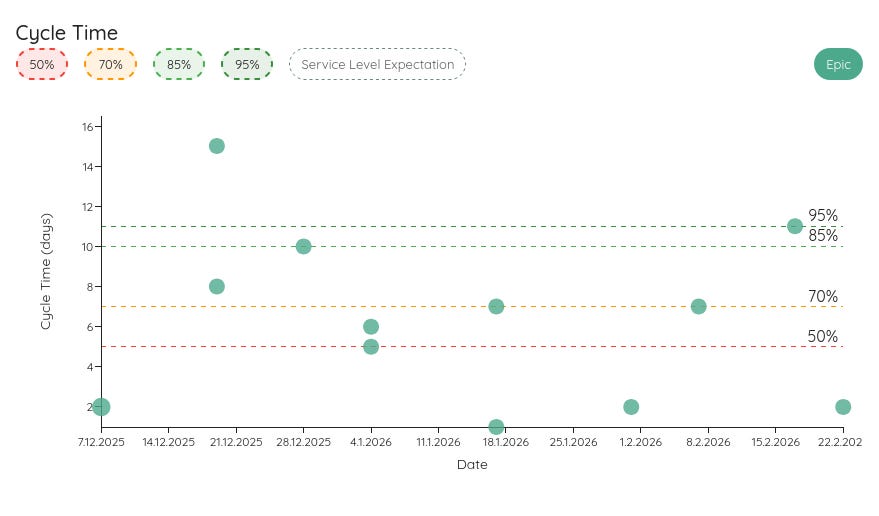 If we look at the Cycle Time of our Features, we can see that 85% of all our Epics are closed within 10 days after we started. 70% are done within 7 days of starting. This means if we start today, we have the Feature not only done, but also tested, documented, and released within a week.