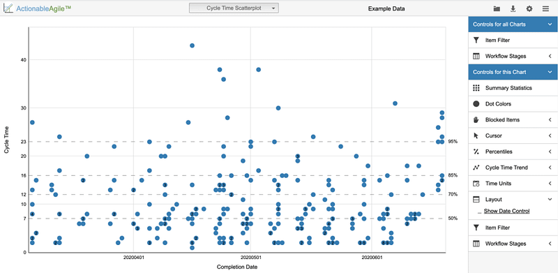 Nowadays many teams have embraced probabilistic forecasting. Those teams could use Cycle Time scatterplots to forecast when an individual item will be done, for example, “there is an 85% chance that we deliver this Product Backlog Item (PBI) within 10 days or less”.
